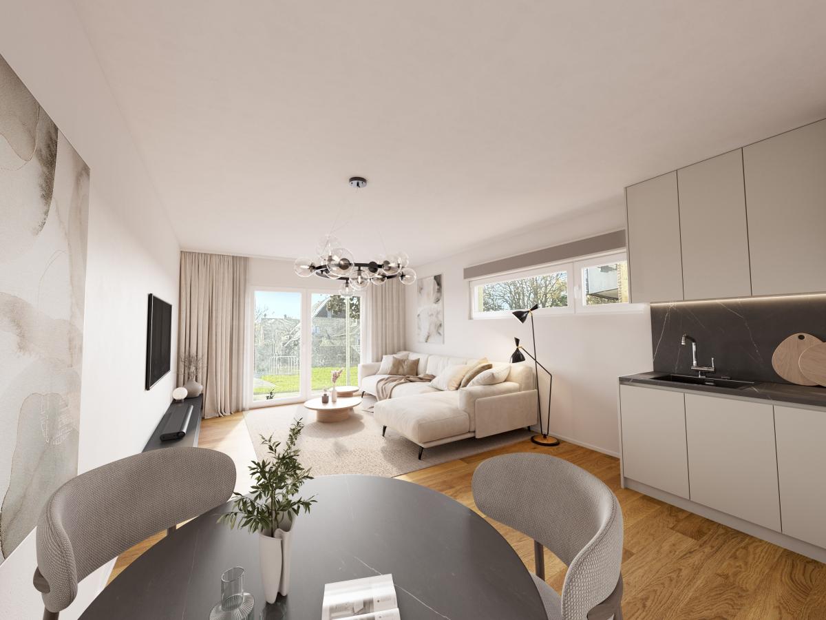 Der großzügige Wohn- und Essbereich bildet das Herzstück dieser Immobilie. Durchdacht geschnitten und lichtdurchflutet bietet er viel Raum für individuelle Gestaltung. Die offene Küche fügt sich harmonisch in das Wohnkonzept ein und unterstreicht den modernen Charakter des Neubaus. Eine sonnige Terrasse erweitert den Wohnbereich an wärmeren Tagen und schafft einen einladenden Platz für entspannte Stunden im Freien.