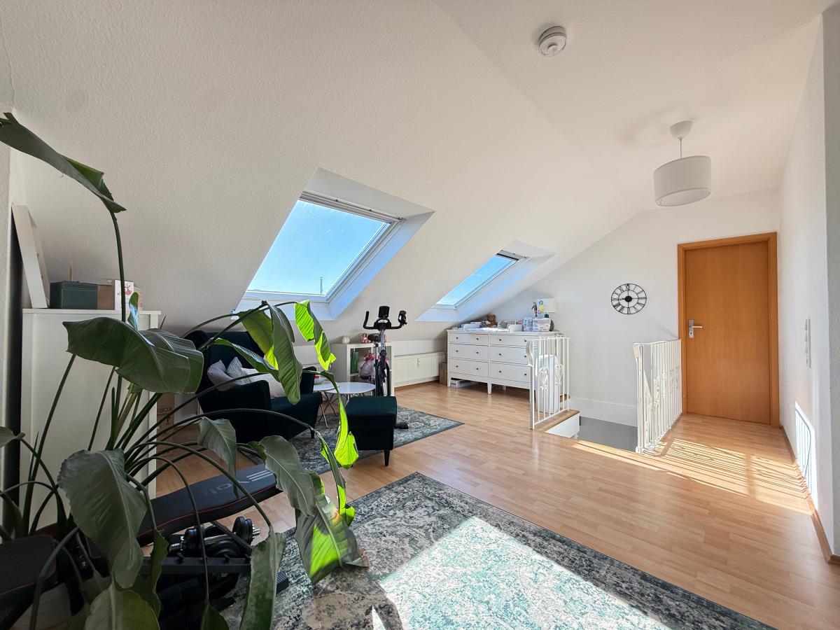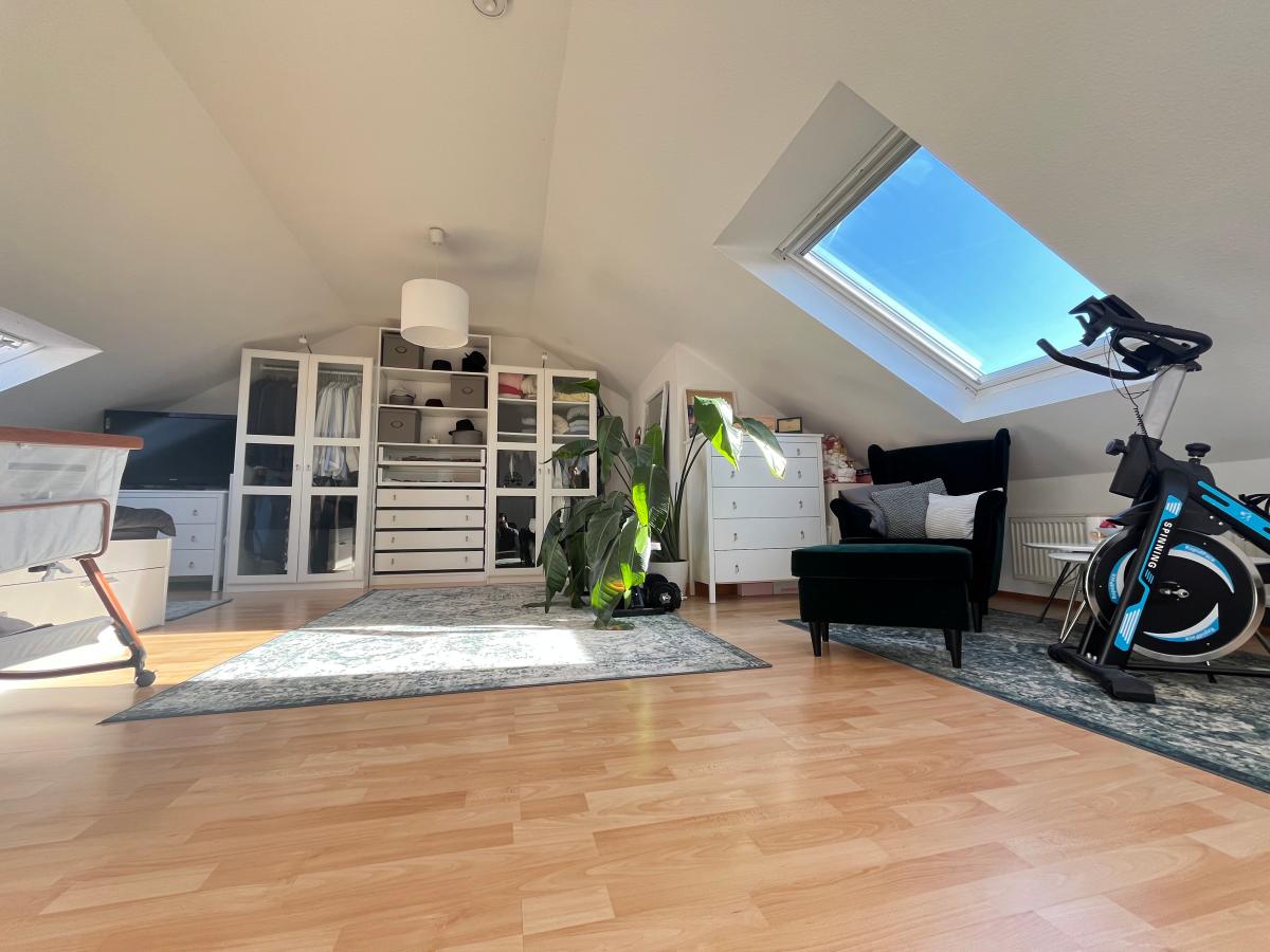 Über eine Treppe innerhalb der Wohnung gelangen Sie in den ausgebauten Spitzboden, der den oberen Bereich der Maisonette bildet. Hier erwartet Sie ein großzügiger Studio-Bereich inklusive Badezimmer mit rund 34 Quadratmetern, der durch seine offene Gestaltung und die angenehme Helligkeit eine besondere Wohnatmosphäre schafft. Der Raum eignet sich ideal als Schlafzimmer und bildet einen separaten Privatsphärenbereich innerhalb der Wohnung. Ergänzt wird diese Ebene durch ein Bad en Suite, das den Studiocharakter zusätzlich unterstreicht und für hohen Wohnkomfort sorgt.